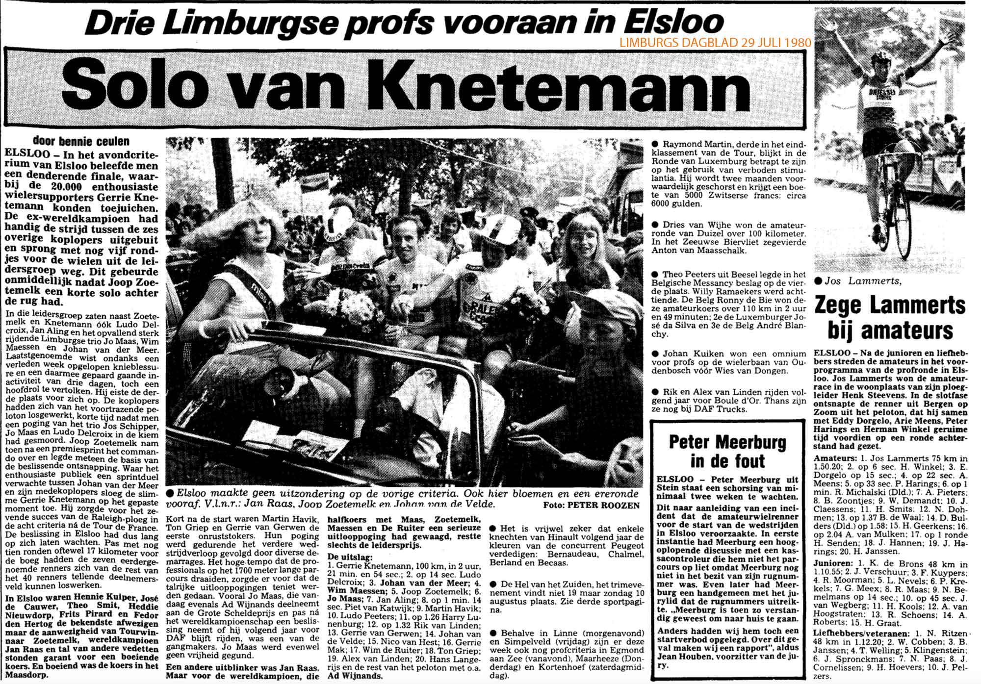 In 1980 toen Tourwinnaar Joop Zoetemelk op maandag 28 juli aan de start stond, werd Elsloo overspoeld door maar liefst 25.000 toeschouwers. Een feest om nooit te vergeten. Zie foto boven.