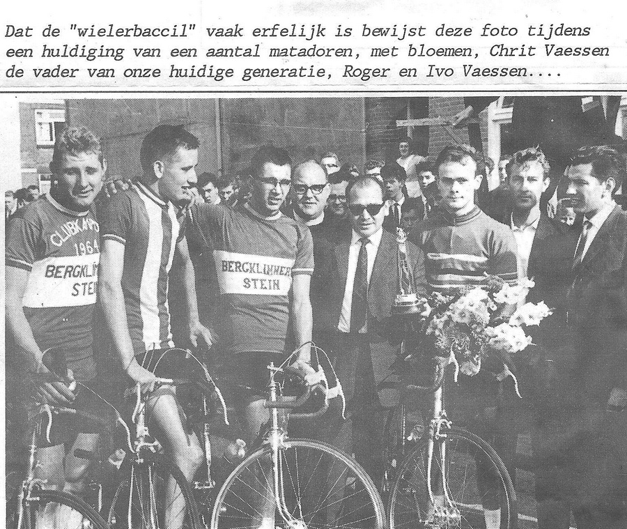 "Dat de wielerbaccil vaak erfelijk is bewijst bewijst deze foto tijdens een huldiging van een aantal matadoren, met bloemen, Chrit Vaessen de vader van onze huidige generatie, Roger en Ivo Vaessen...."