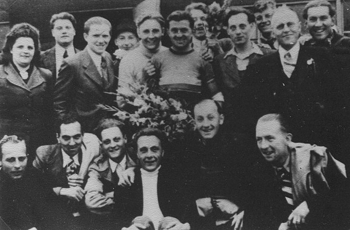 Foto boven: Sjeng Collard, voorin midden, in 1968 betrokken in huldiging Tourwinnaar Jan Janssen (niet op foto) Achterin zitten de ploeggenoten die de Tour ook uitgereden hebben: Eef Dolman, Eddy Beugels en Arie den Hartog.